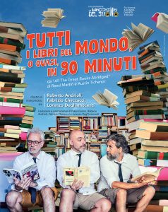 Il gioco col pubblico è alla base di “Tutti i libri del Mondo, o quasi, in 90 minuti” che si confronta con i tre attori in un dialogo continuo e irresistibilmente comico durante il quale si sentono voci alzarsi dalla platea che dicono “io l’ho letto!”